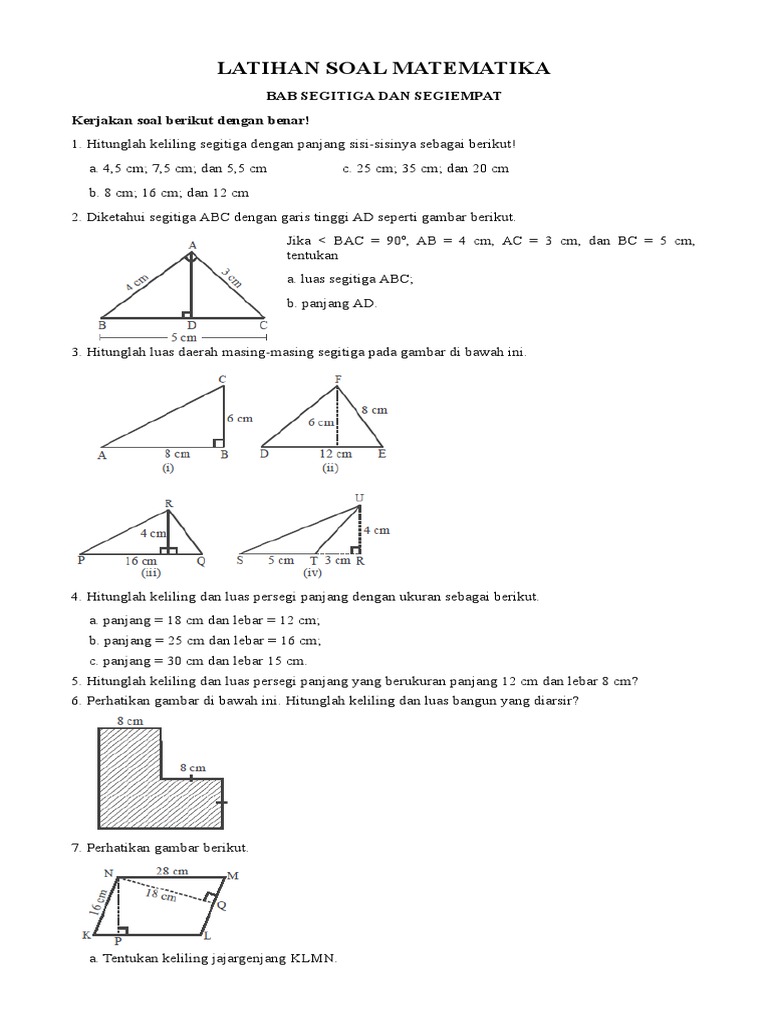 Keliling suatu segitiga sama kaki adalah 56 cm dan ac bc 18 cm adalah. Kompetensi inti pembelajaran matematika kelas vii 1 menghargai dan menghayati ajaran agama yang dianutnya menghargai dan menghayati perilaku jujur, disiplin, tanggungjawab, peduli (toleransi, gotong royong), santun, 2 percaya diri, dalam berinteraksi secara efektif dengan lingkungan sosial dan alam dalam. Soal uh mtk smp kelas 7 bab segitiga dan segi empat.pdf. 20201007 docfuzziblog soal pilihan ganda program linear dan jawabannya doc langsung saja ya kita cek contoh soal dan jawaban. Keliling bangun berikut adalah 2.